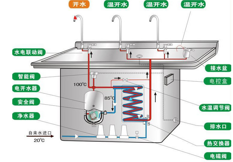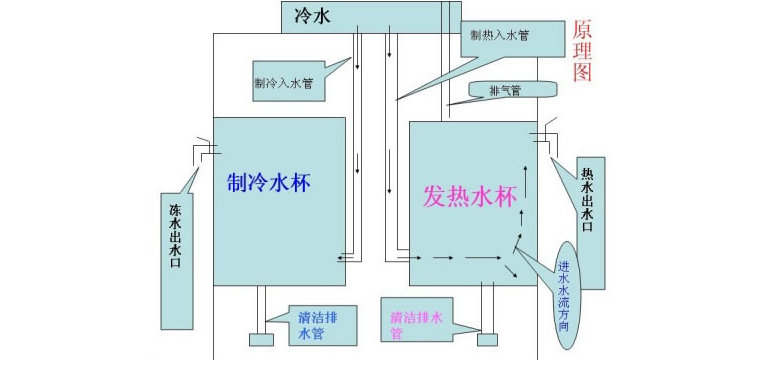 1.直冷式冷熱飲水機由水箱提供常溫水,進水分兩路:一路進入冷膽容器,經制冷出冷水;另一路進入熱罐,經加熱出熱水。