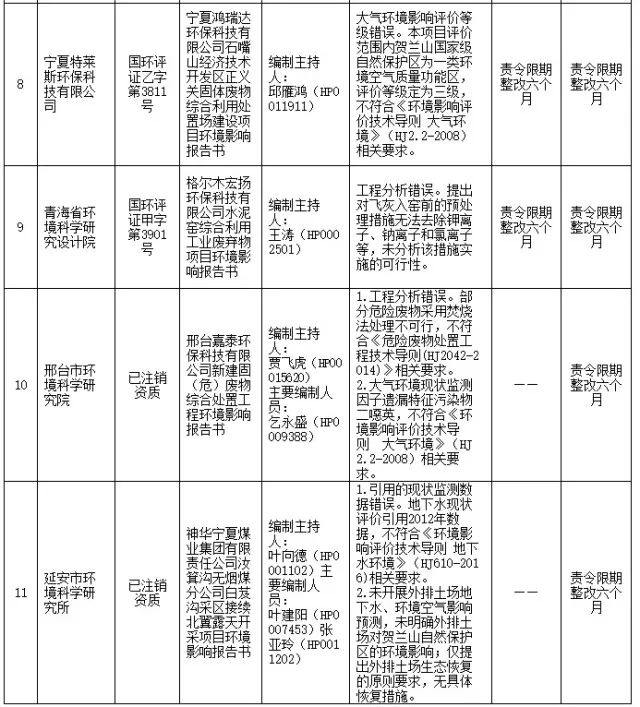 經(jīng)復(fù)核,共發(fā)現(xiàn)21個(gè)建設(shè)項(xiàng)目環(huán)境影響報(bào)告書(表)存在較大問題。根據(jù)《建設(shè)項(xiàng)目環(huán)境影響評(píng)價(jià)資質(zhì)管理辦法》(環(huán)境保護(hù)部令第36號(hào))有關(guān)規(guī)定,對(duì)9家環(huán)評(píng)機(jī)構(gòu)(另有2家機(jī)構(gòu)已注銷資質(zhì)不再處理)及26名環(huán)評(píng)工程師作出行政處理。其中,責(zé)令環(huán)評(píng)文件存在主要環(huán)境保護(hù)目標(biāo)遺漏、主要環(huán)境保護(hù)措施缺失等問題的4家環(huán)評(píng)機(jī)構(gòu)和10名環(huán)評(píng)工程師限期整改十二個(gè)月;責(zé)令環(huán)評(píng)文件存在建設(shè)項(xiàng)目工程分析或者引用的現(xiàn)狀監(jiān)測(cè)數(shù)據(jù)錯(cuò)誤等問題的5家環(huán)評(píng)機(jī)構(gòu)和16名環(huán)評(píng)工程師限期整改六個(gè)月。有關(guān)問題及處理意見詳見附件。其他問題處理結(jié)果將另行通報(bào)。